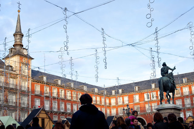 Главная площадь Мадрида Пласа-Майор (Plaza Mayor, Madrid, метро Sol). Площадь балконов, она состоит из зданий в одном стиле соединенных в прямоугольник с арками и множеством балконов. Площадь служила для праздников, казней, коррид, на балконы выходили королевская семья и придворные понаблюдать за зрелищем, а сейчас основную часть занимают отели. Новый год большинство туристов встречали именно здесь.