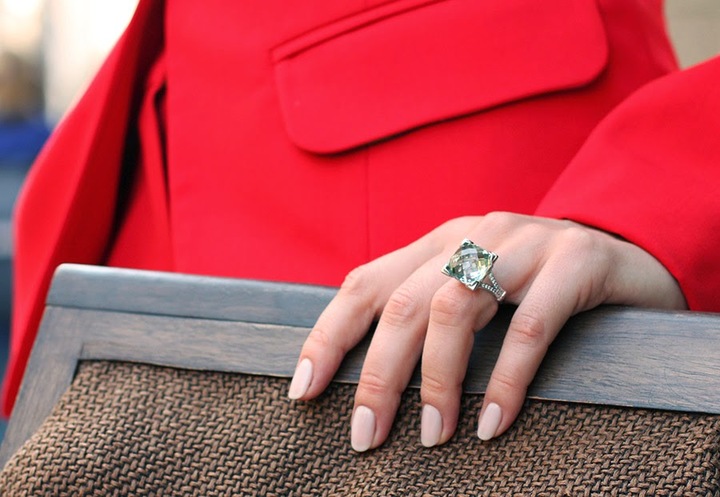 Из аксессуаров только серебряное кольцо с кварцем и фианитами от ювелирного завода Diamant и солнечные очки.